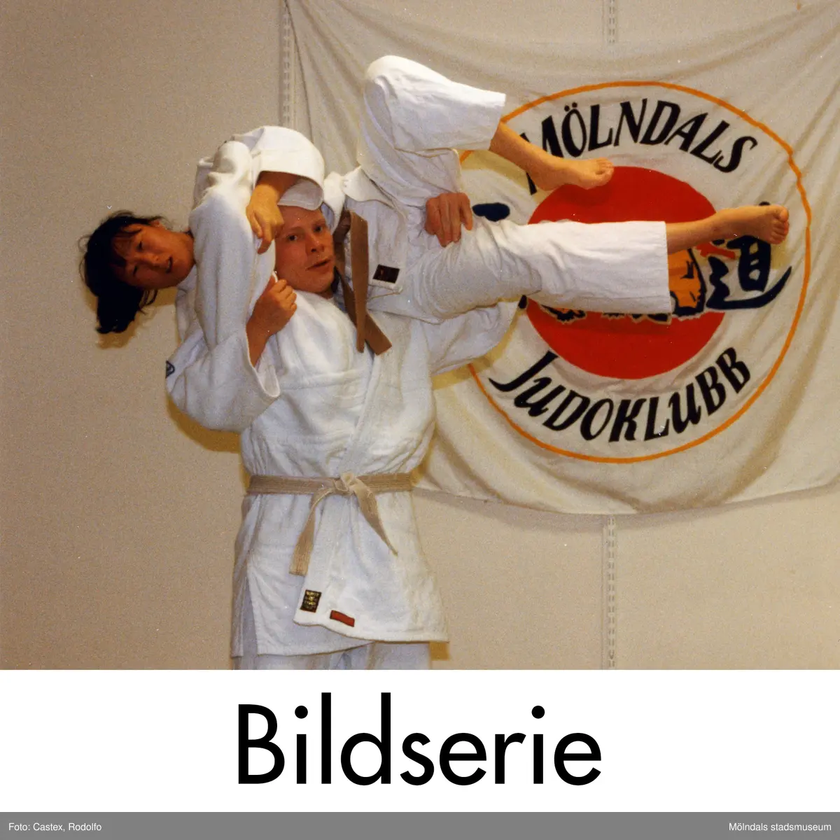 Serie om fem fotografier som visar en man och en kvinna från Mölndals Judoklubb träna judo i oktober 1996.
