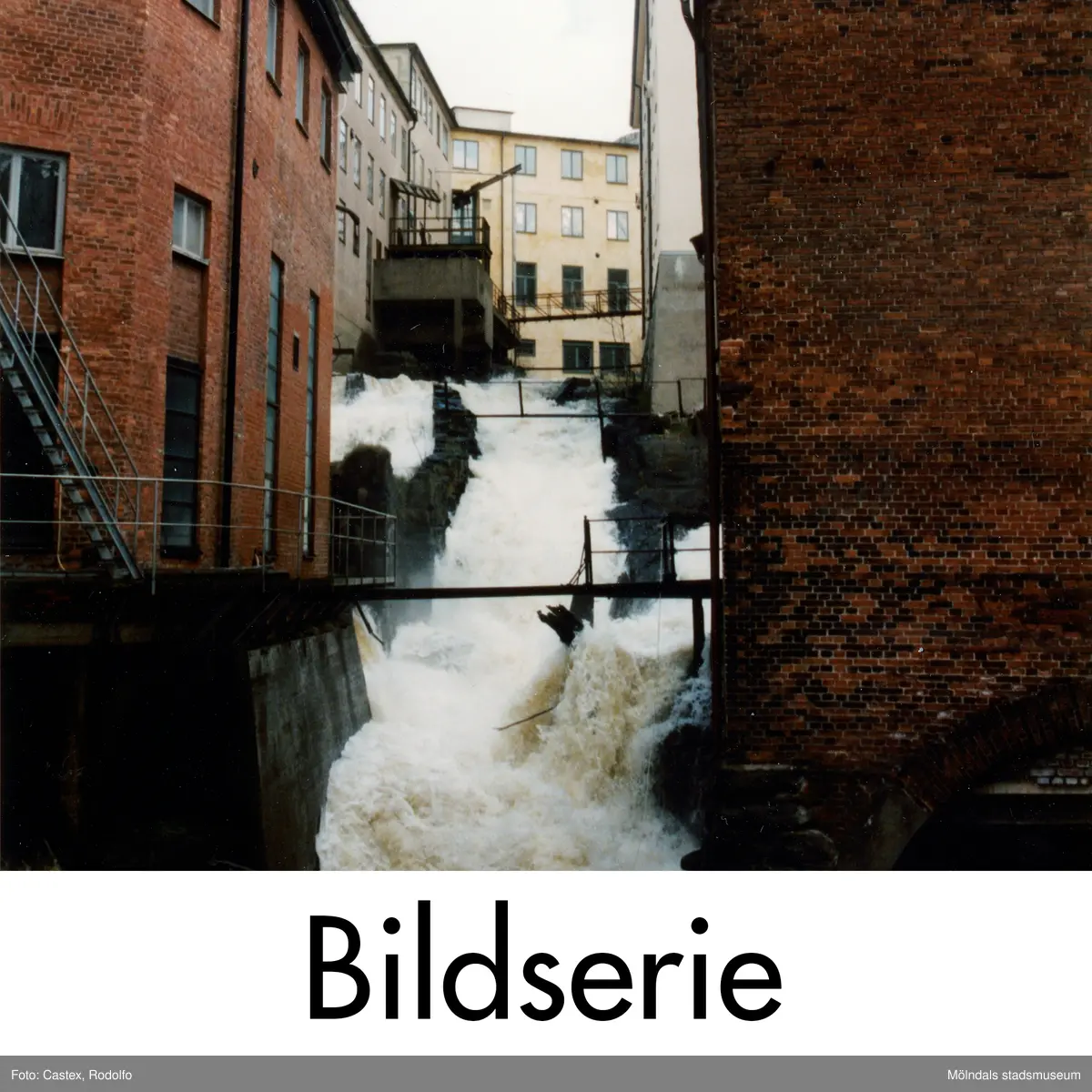 Serie om tre fotografier som visar Mölndalsfallen med intilliggande industribyggnader i Mölndals Kvarnby, okänt årtal.