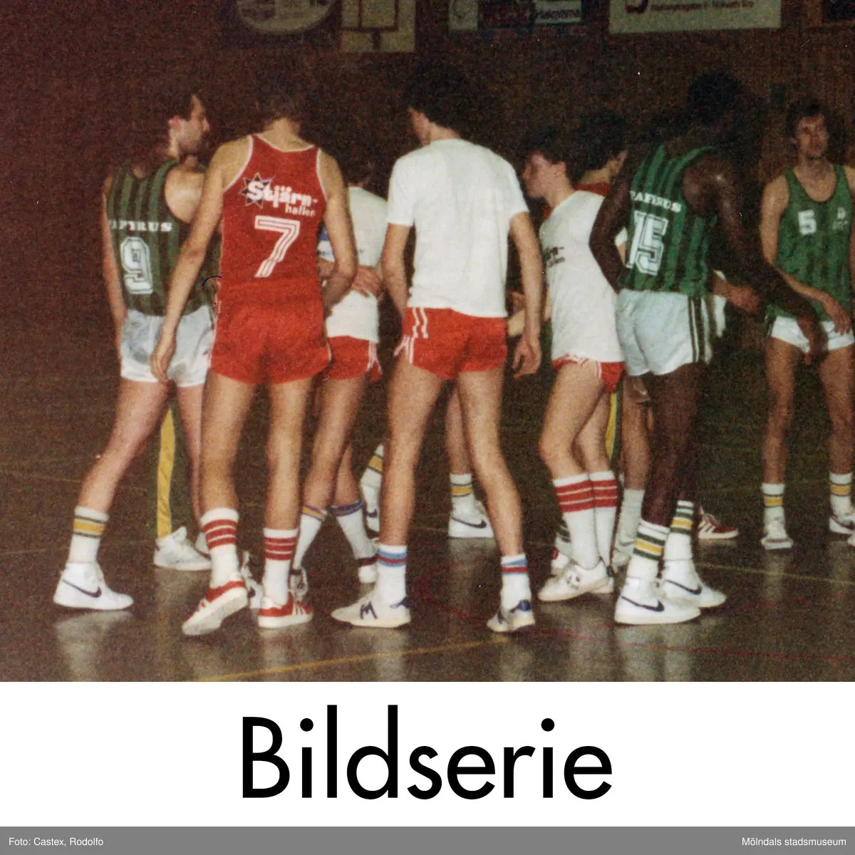 Serie om två fotografier som visar Kvarnby Baskets A-lag herrar spela match i idrotthuset i Mölndal, mars 1984. Motståndarlag och slutresultat är okända.