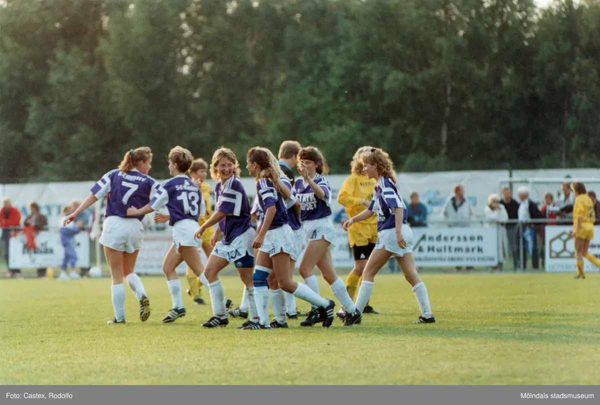 Fotbollslaget Jitex BK spelar match mot Öxabäcks IF på Kvarnbyvallen i Mölndal, maj 1990. Jitex BK vann matchen med 3-1.