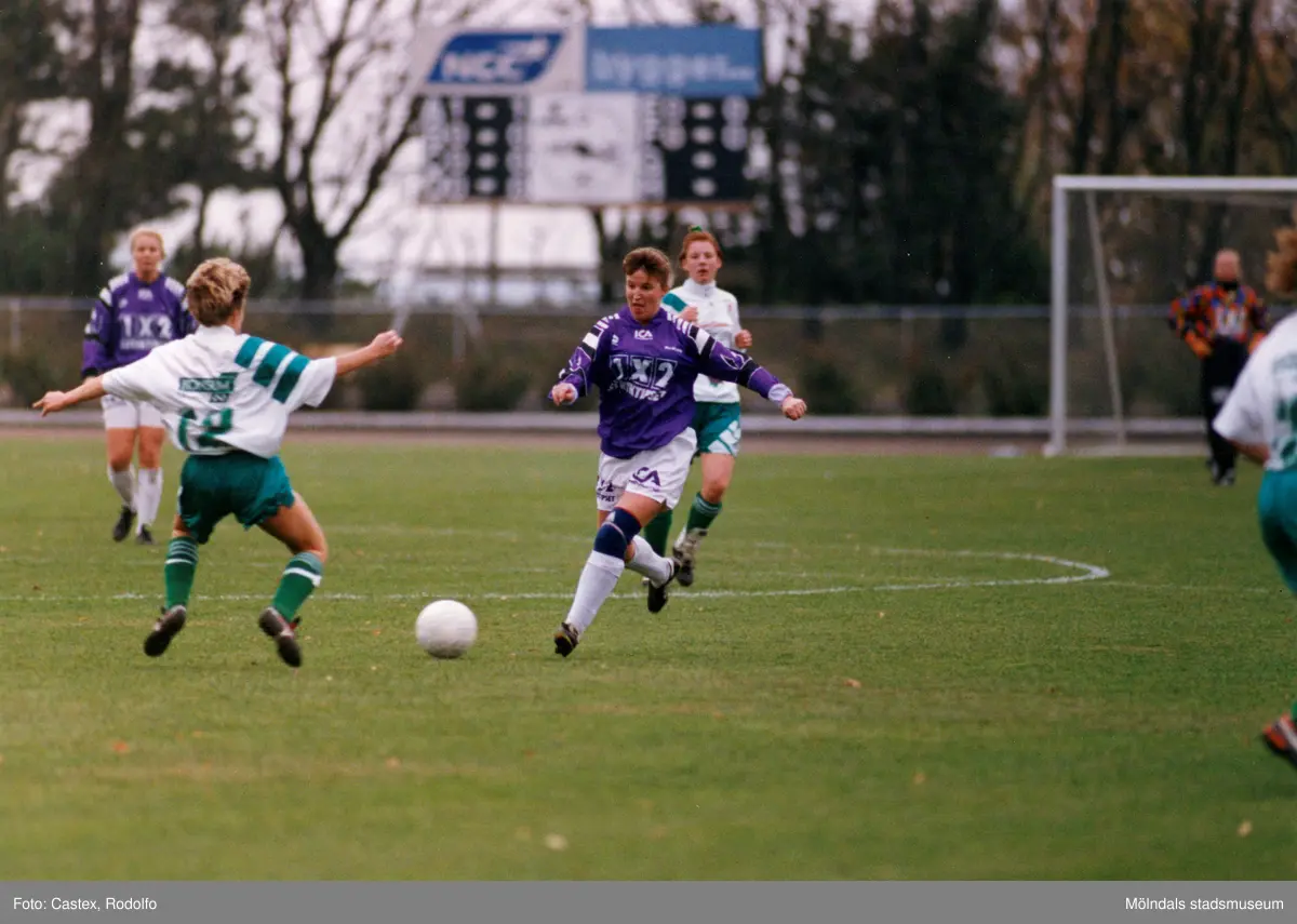 Titel: Fotbollslaget Jitex BK spelar match på Kvarnbyvallen i Mölndal, år 1994. Motståndarlag och slutresultat är okända.