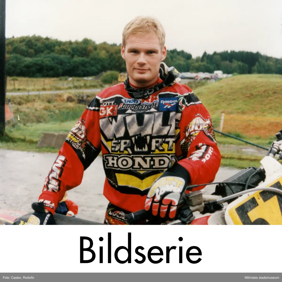 Serie om två fotografier som visar porträtt av en motocrossförare. Fotografierna är tagna i samband med SM i motocross på Blixåsbanan i Balltorp, Mölndal, år 1998.