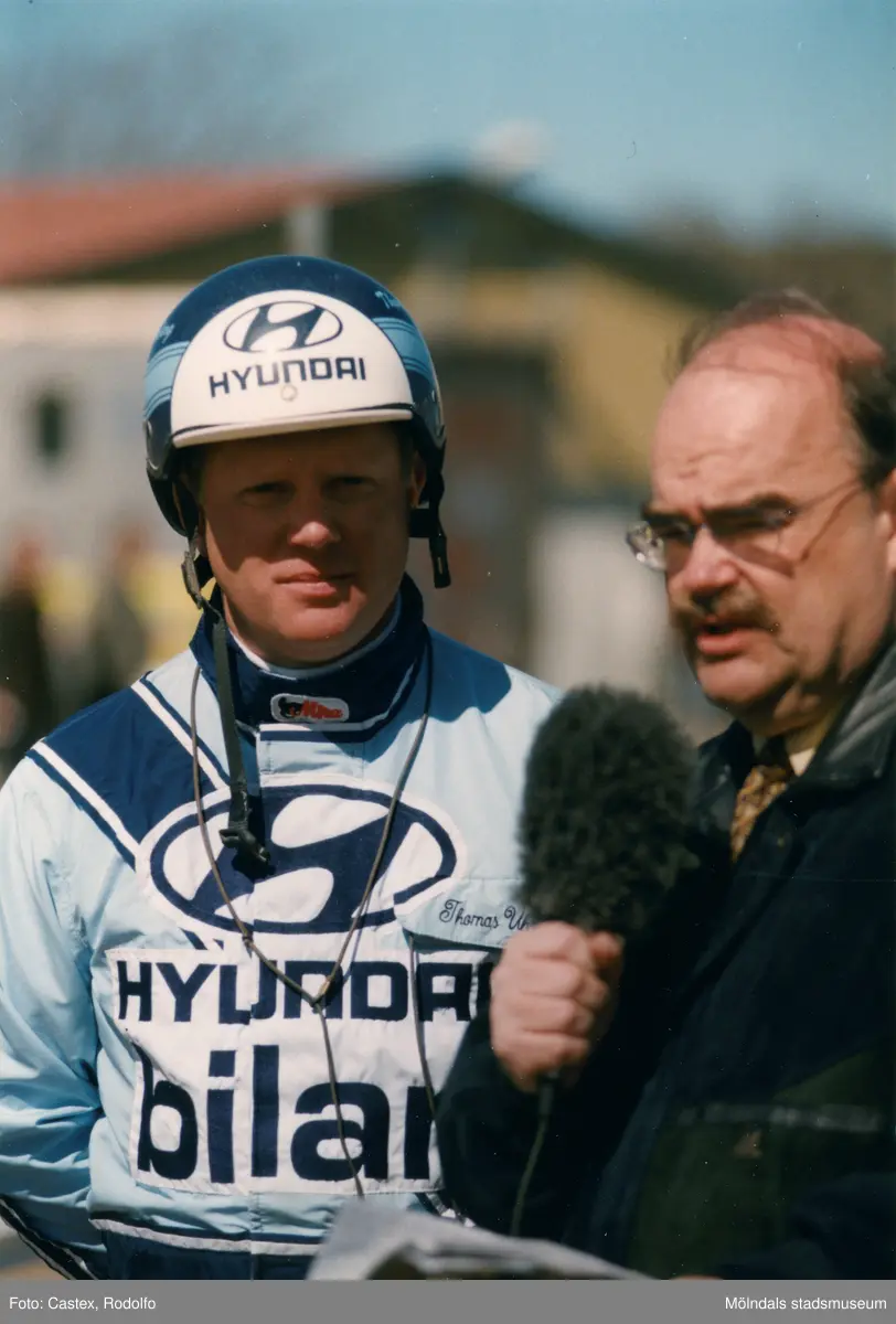 Sportjournalisten Leif "Loket" Olsson intervjuar travkusken Thomas Uhrberg. Fotografi taget i samband med travloppet Drottning Silvias Pokal på Åbytravet i Åby, Mölndal, söndagen den 3 maj 1997.
