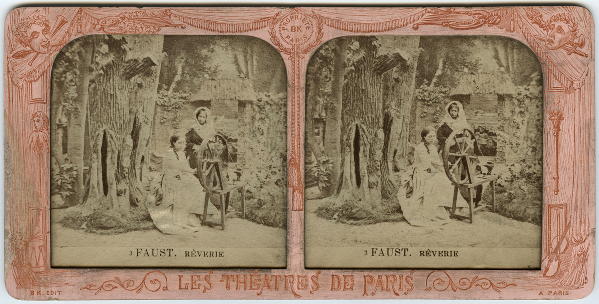Stereokort ur serien Les théatres de Paris, utgiven av BK, Paris på 1880-talet. Bilden föreställer en scen ur operan Faust. Stereokortet är ett så kallat French tissue bestående av ett handkolorerat albuminfoto monterat i kartongram med tunt papper på baksidan. När kortet belyses bakifrån framträder färgerna. Kopian av kortet har framställts med två olika metoder: skanning på flatbäddsskanner och fotografering på ljusbord.