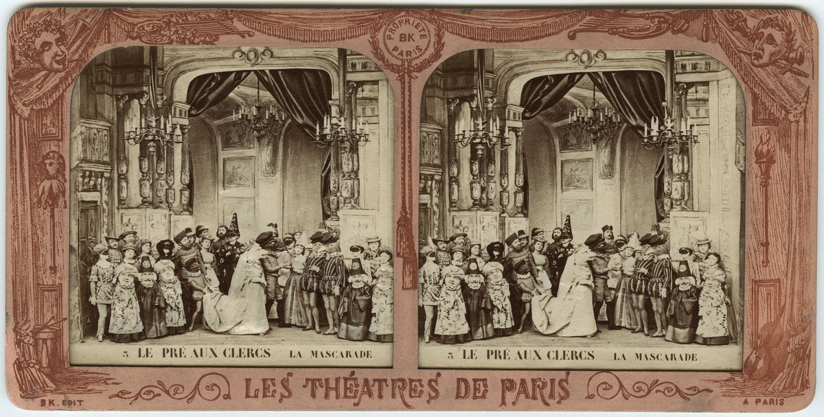 Stereokort ur serien Les théatres de Paris, utgiven av BK, Paris på 1860-talet. Bilden föreställer en scen ur operan Duellen. Stereokortet är ett så kallat French tissue bestående av ett handkolorerat albuminfoto monterat i kartongram med tunt papper på baksidan. När kortet belyses bakifrån framträder färgerna. Kopian av kortet har framställts med två olika metoder: skanning på flatbäddsskanner och fotografering på ljusbord.