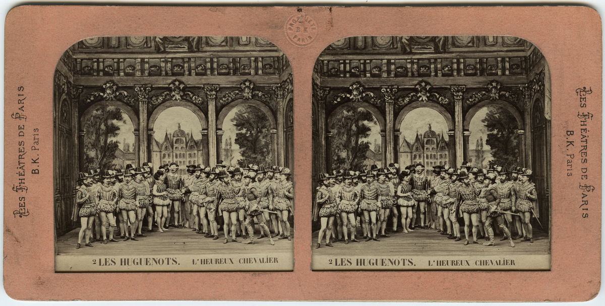 Stereokort ur serien Les théatres de Paris, utgiven av BK, Paris på 1860-talet. Bilden föreställer en scen ur operan Hugenotterna. Stereokortet är ett så kallat French tissue bestående av ett handkolorerat albuminfoto monterat i kartongram med tunt papper på baksidan. När kortet belyses bakifrån framträder färgerna. Kopian av kortet har framställts med två olika metoder: skanning på flatbäddsskanner och fotografering på ljusbord.
