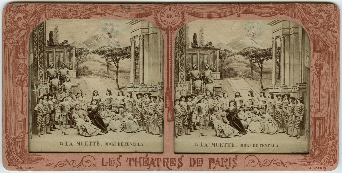 Stereokort ur serien Les théatres de Paris, utgiven av BK, Paris på 1860-talet. Bilden föreställer en scen ur operan Den stumma från Portici. Stereokortet är ett så kallat French tissue bestående av ett handkolorerat albuminfoto monterat i kartongram med tunt papper på baksidan. När kortet belyses bakifrån framträder färgerna. Kopian av kortet har framställts med två olika metoder: skanning på flatbäddsskanner och fotografering på ljusbord.