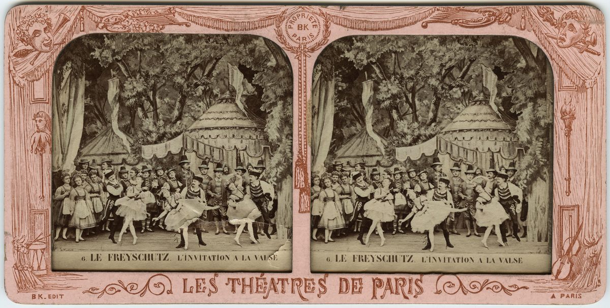 Titel: Stereokort ur serien Les théatres de Paris, utgiven av BK, Paris på 1870-talet. Bilden föreställer en scen ur operan Friskytten. Stereokortet är ett så kallat French tissue bestående av ett handkolorerat albuminfoto monterat i kartongram med tunt papper på baksidan. När kortet belyses bakifrån framträder färgerna. Kopian av kortet har framställts med två olika metoder: skanning på flatbäddsskanner och fotografering på ljusbord.