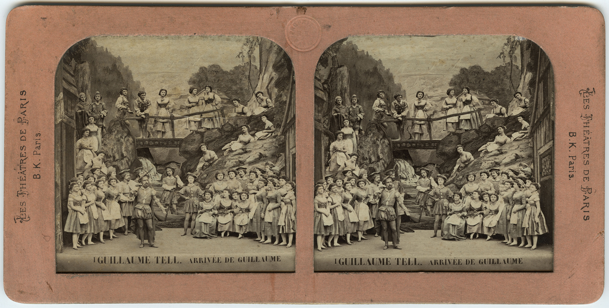 Stereokort (skadat) ur serien Les théatres de Paris, utgiven av BK, Paris på 1860-talet. Bilden föreställer en scen ur operan Wilhelm Tell. Stereokortet är ett så kallat French tissue bestående av ett handkolorerat albuminfoto monterat i kartongram med tunt papper på baksidan. När kortet belyses bakifrån framträder färgerna. Kopian av kortet har framställts med två olika metoder: skanning på flatbäddsskanner och fotografering på ljusbord.