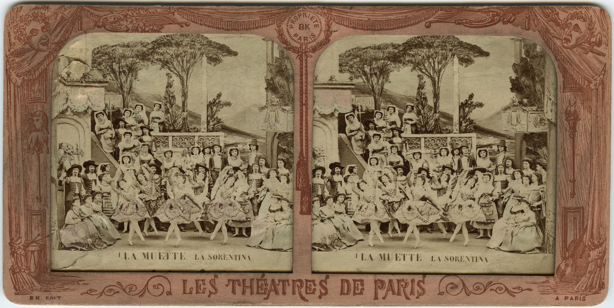 Stereokort (skadat) ur serien Les théatres de Paris, utgiven av BK, Paris på 1860-talet. Bilden föreställer en scen ur operan Den stumma från Portici. Stereokortet är ett så kallat French tissue bestående av ett handkolorerat albuminfoto monterat i kartongram med tunt papper på baksidan. När kortet belyses bakifrån framträder färgerna. Kopian av kortet har framställts med två olika metoder: skanning på flatbäddsskanner och fotografering på ljusbord.