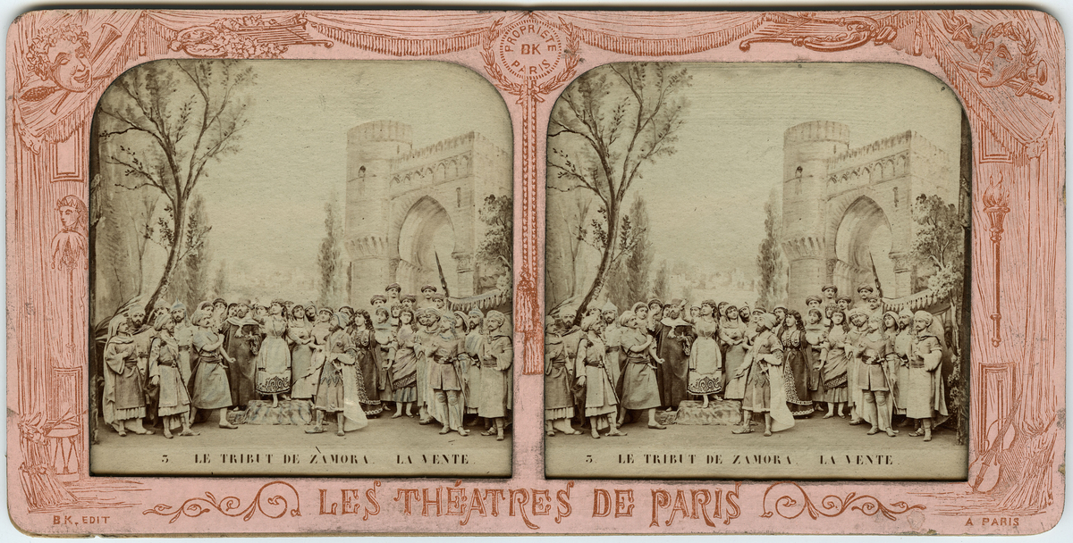 Stereokort ur serien Les théatres de Paris, utgiven av BK, Paris på 1880-talet. Bilden föreställer en scen ur operan Le tribut de Zamora (svensk titel okänd). Stereokortet är ett så kallat French tissue bestående av ett handkolorerat albuminfoto monterat i kartongram med tunt papper på baksidan. När kortet belyses bakifrån framträder färgerna. Kopian av kortet har framställts med två olika metoder: skanning på flatbäddsskanner och fotografering på ljusbord.