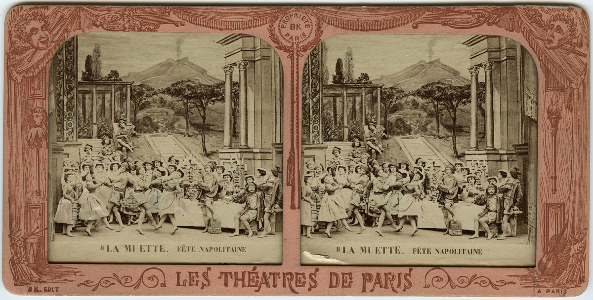 Stereokort (skadat) ur serien Les théatres de Paris, utgiven av BK, Paris på 1860-talet. Bilden föreställer en scen ur operan Den stumma från Portici. Stereokortet är ett så kallat French tissue bestående av ett handkolorerat albuminfoto monterat i kartongram med tunt papper på baksidan. När kortet belyses bakifrån framträder färgerna. Kopian av kortet har framställts med två olika metoder: skanning på flatbäddsskanner och fotografering på ljusbord.