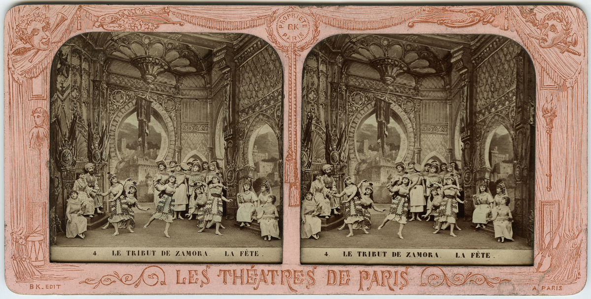 Stereokort ur serien Les théatres de Paris, utgiven av BK, Paris på 1880-talet. Bilden föreställer en scen ur operan Le tribut de Zamora (svensk titel okänd). Stereokortet är ett så kallat French tissue bestående av ett handkolorerat albuminfoto monterat i kartongram med tunt papper på baksidan. När kortet belyses bakifrån framträder färgerna. Kopian av kortet har framställts med två olika metoder: skanning på flatbäddsskanner och fotografering på ljusbord.