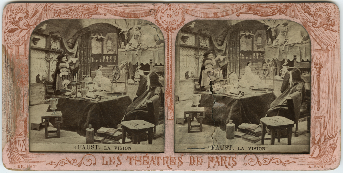 Stereokort (skadat) ur serien Les théatres de Paris, utgiven av BK, Paris på 1880-talet. Bilden föreställer en scen ur operan Faust. Stereokortet är ett så kallat French tissue bestående av ett handkolorerat albuminfoto monterat i kartongram med tunt papper på baksidan. När kortet belyses bakifrån framträder färgerna. Kopian av kortet har framställts med två olika metoder: skanning på flatbäddsskanner och fotografering på ljusbord.