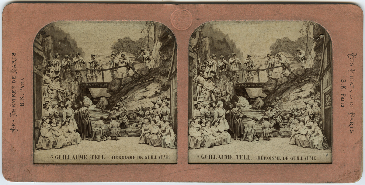 Stereokort ur serien Les théatres de Paris, utgiven av BK, Paris på 1860-talet. Bilden föreställer en scen ur operan Wilhelm Tell. Stereokortet är ett så kallat French tissue bestående av ett handkolorerat albuminfoto monterat i kartongram med tunt papper på baksidan. När kortet belyses bakifrån framträder färgerna. Kopian av kortet har framställts med två olika metoder: skanning på flatbäddsskanner och fotografering på ljusbord.