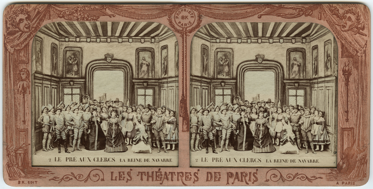 Stereokort ur serien Les théatres de Paris, utgiven av BK, Paris på 1860-talet. Bilden föreställer en scen ur operan Duellen. Stereokortet är ett så kallat French tissue bestående av ett handkolorerat albuminfoto monterat i kartongram med tunt papper på baksidan. När kortet belyses bakifrån framträder färgerna. Kopian av kortet har framställts med två olika metoder: skanning på flatbäddsskanner och fotografering på ljusbord.