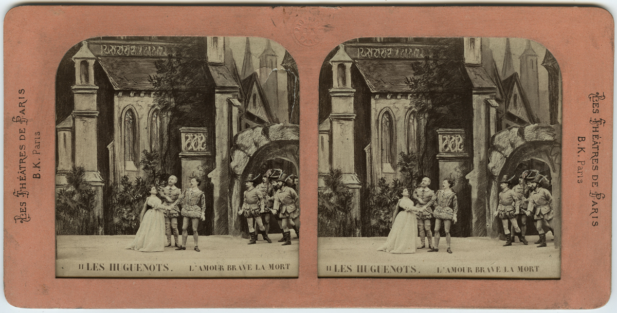 Stereokort ur serien Les théatres de Paris, utgiven av BK, Paris på 1860-talet. Bilden föreställer en scen ur operan Hugenotterna. Stereokortet är ett så kallat French tissue bestående av ett handkolorerat albuminfoto monterat i kartongram med tunt papper på baksidan. När kortet belyses bakifrån framträder färgerna. Kopian av kortet har framställts med två olika metoder: skanning på flatbäddsskanner och fotografering på ljusbord.
