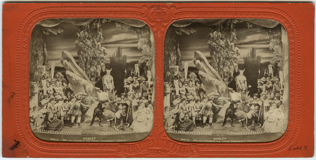 Stereokort ur serien Actualités Théatrales utgiven på 1860-talet. Bilden föreställer en scen ur operan Hamlet. Stereokortet är ett så kallat French tissue bestående av ett handkolorerat albuminfoto monterat i kartongram med tunt papper på baksidan. När kortet belyses bakifrån framträder färgerna. Kopian av kortet har framställts med två olika metoder: skanning på flatbäddsskanner och fotografering på ljusbord.