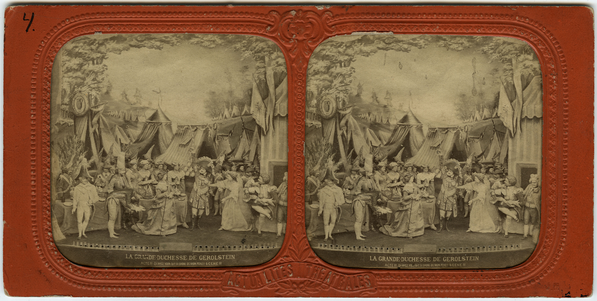 Stereokort ur serien Actualités Théatrales utgiven på 1860-talet. Bilden föreställer en scen ur operetten Storhertiginnan av Gerolstein. Stereokortet är ett så kallat French tissue bestående av ett handkolorerat albuminfoto monterat i kartongram med tunt papper på baksidan. När kortet belyses bakifrån framträder färgerna. Kopian av kortet har framställts med två olika metoder: skanning på flatbäddsskanner och fotografering på ljusbord.