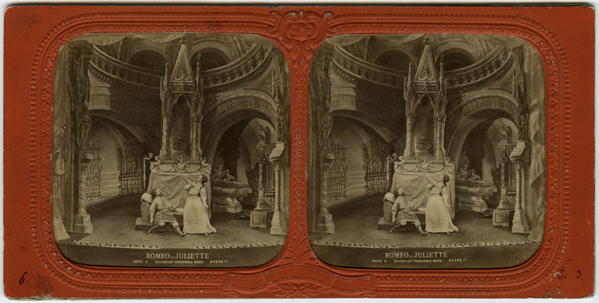 Stereokort ur serien Actualités Théatrales utgiven på 1860-talet. Bilden föreställer en scen ur operan Romeo och Julia. Stereokortet är ett så kallat French tissue bestående av ett handkolorerat albuminfoto monterat i kartongram med tunt papper på baksidan. När kortet belyses bakifrån framträder färgerna. Kopian av kortet har framställts med två olika metoder: skanning på flatbäddsskanner och fotografering på ljusbord.
