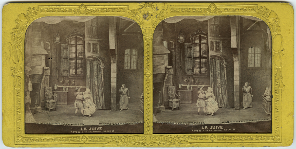 Stereokort (skadat) ur serien Actualités Théatrales utgiven på 1860-talet. Bilden föreställer en scen ur operan Judinnan. Stereokortet är ett så kallat French tissue bestående av ett handkolorerat albuminfoto monterat i kartongram med tunt papper på baksidan. När kortet belyses bakifrån framträder färgerna. Kopian av kortet har framställts med två olika metoder: skanning på flatbäddsskanner och fotografering på ljusbord.