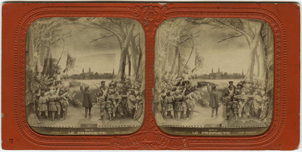 Stereokort ur serien Actualités Théatrales utgiven på 1860-talet. Bilden föreställer en scen ur operan Profeten. Stereokortet är ett så kallat French tissue bestående av ett handkolorerat albuminfoto monterat i kartongram med tunt papper på baksidan. När kortet belyses bakifrån framträder färgerna. Kopian av kortet har framställts med två olika metoder: skanning på flatbäddsskanner och fotografering på ljusbord.
