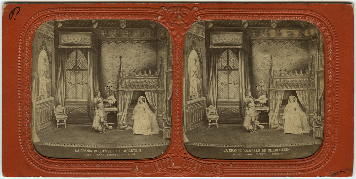 Stereokort ur serien Actualités Théatrales utgiven på 1860-talet. Bilden föreställer en scen ur operetten Storhertiginnan av Gerolstein. Stereokortet är ett så kallat French tissue bestående av ett handkolorerat albuminfoto monterat i kartongram med tunt papper på baksidan. När kortet belyses bakifrån framträder färgerna. Kopian av kortet har framställts med två olika metoder: skanning på flatbäddsskanner och fotografering på ljusbord.