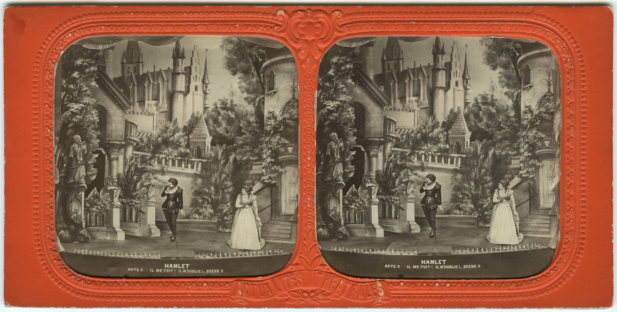 Stereokort ur serien Actualités Théatrales utgiven på 1860-talet. Bilden föreställer en scen ur operan Hamlet. Stereokortet är ett så kallat French tissue bestående av ett handkolorerat albuminfoto monterat i kartongram med tunt papper på baksidan. När kortet belyses bakifrån framträder färgerna. Kopian av kortet har framställts med två olika metoder: skanning på flatbäddsskanner och fotografering på ljusbord.