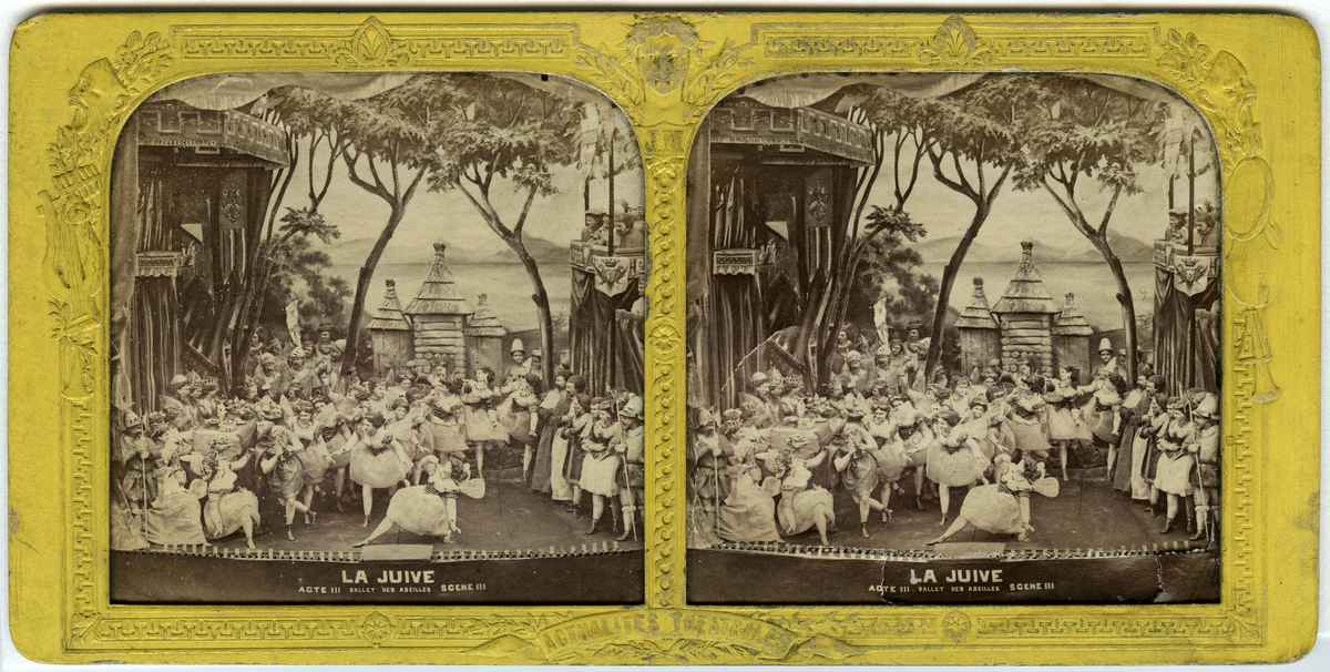 Stereokort (skadat) ur serien Actualités Théatrales utgiven på 1860-talet. Bilden föreställer en scen ur operan Judinnan. Stereokortet är ett så kallat French tissue bestående av ett handkolorerat albuminfoto monterat i kartongram med tunt papper på baksidan. När kortet belyses bakifrån framträder färgerna. Kopian av kortet har framställts med två olika metoder: skanning på flatbäddsskanner och fotografering på ljusbord.