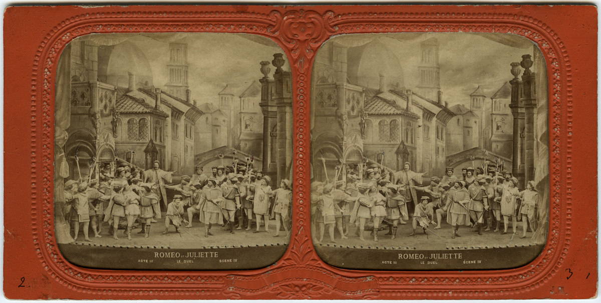 Stereokort ur serien Actualités Théatrales utgiven på 1860-talet. Bilden föreställer en scen ur operan Romeo och Julia. Stereokortet är ett så kallat French tissue bestående av ett handkolorerat albuminfoto monterat i kartongram med tunt papper på baksidan. När kortet belyses bakifrån framträder färgerna. Kopian av kortet har framställts med två olika metoder: skanning på flatbäddsskanner och fotografering på ljusbord.