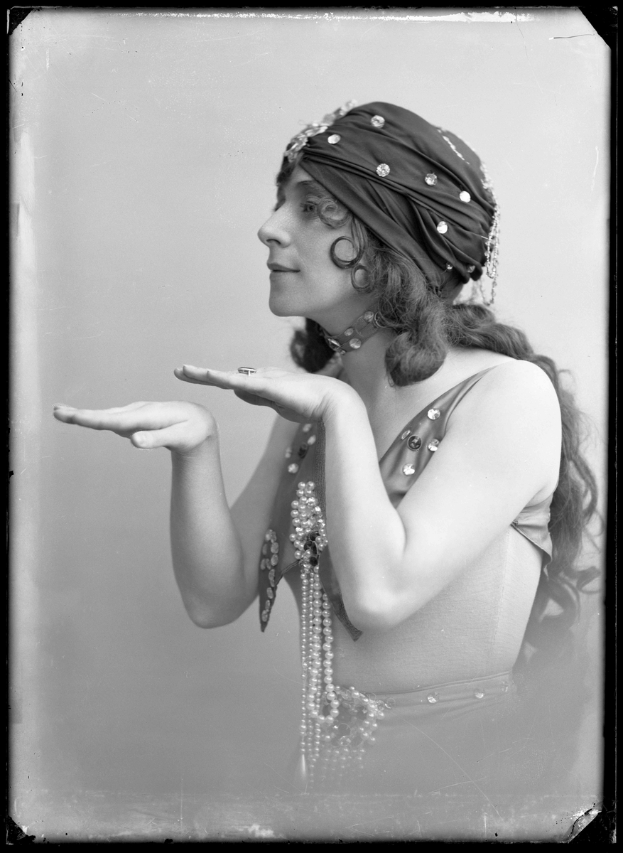 Doris Nelson som Dagmar i pjäsen Simson och Delila (av Sven Lange), Intima teatern 1913. Skannat glasnegativ