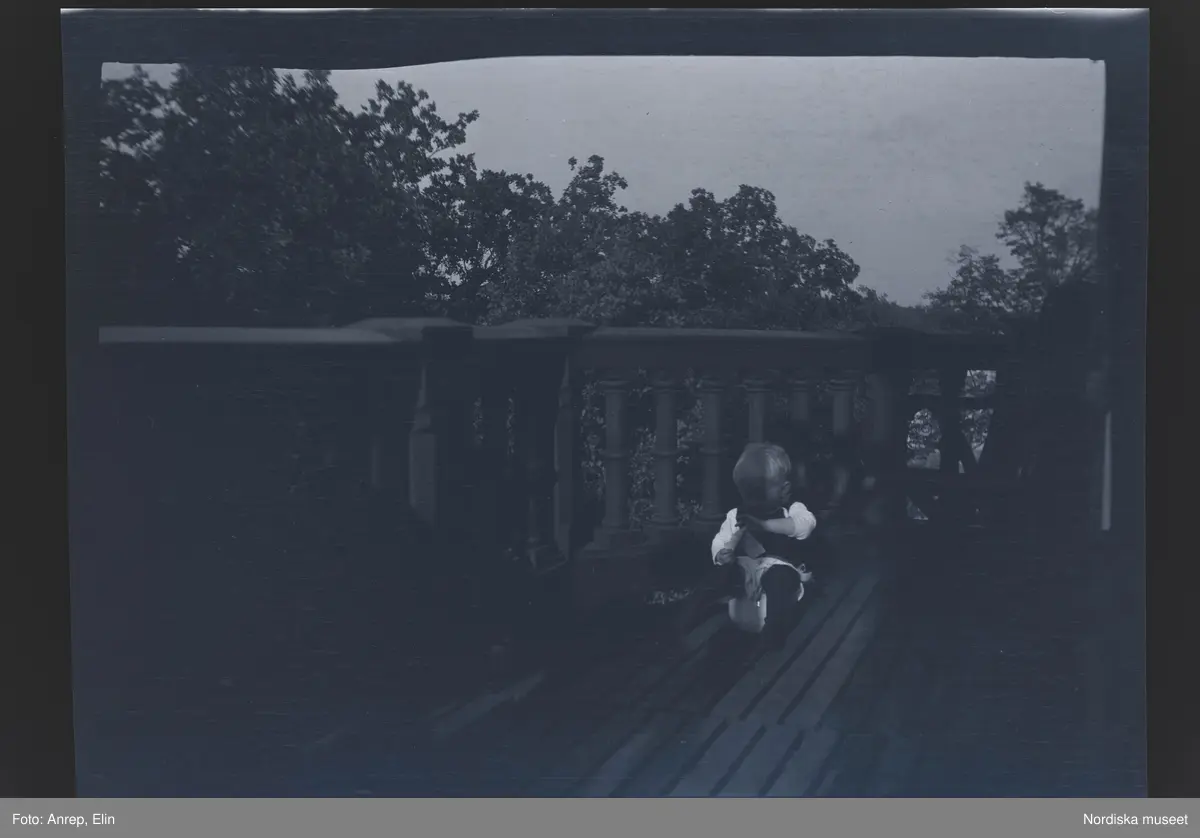 Ett litet barn sitter på pottan ute på balkongen till villa Solveden, Djursholm.