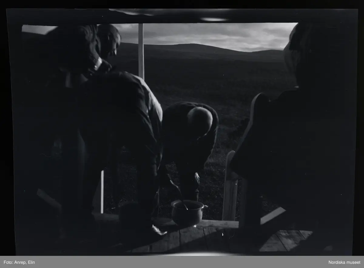Tre män rör i en gryta de tagit ut och ställt på trappen till ett hus.