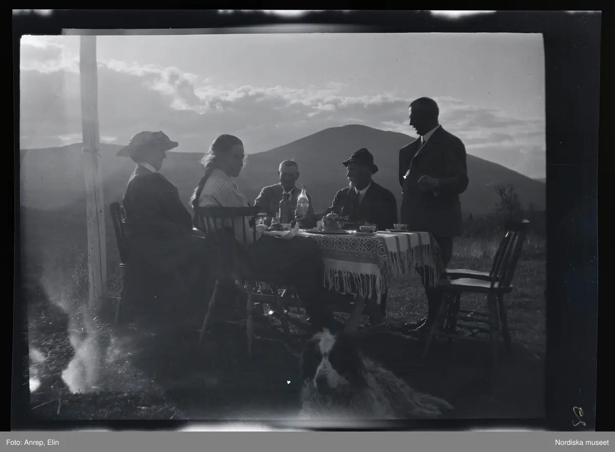 Ett sälskap dricker kaffe och avec vid ett bord utomhus.