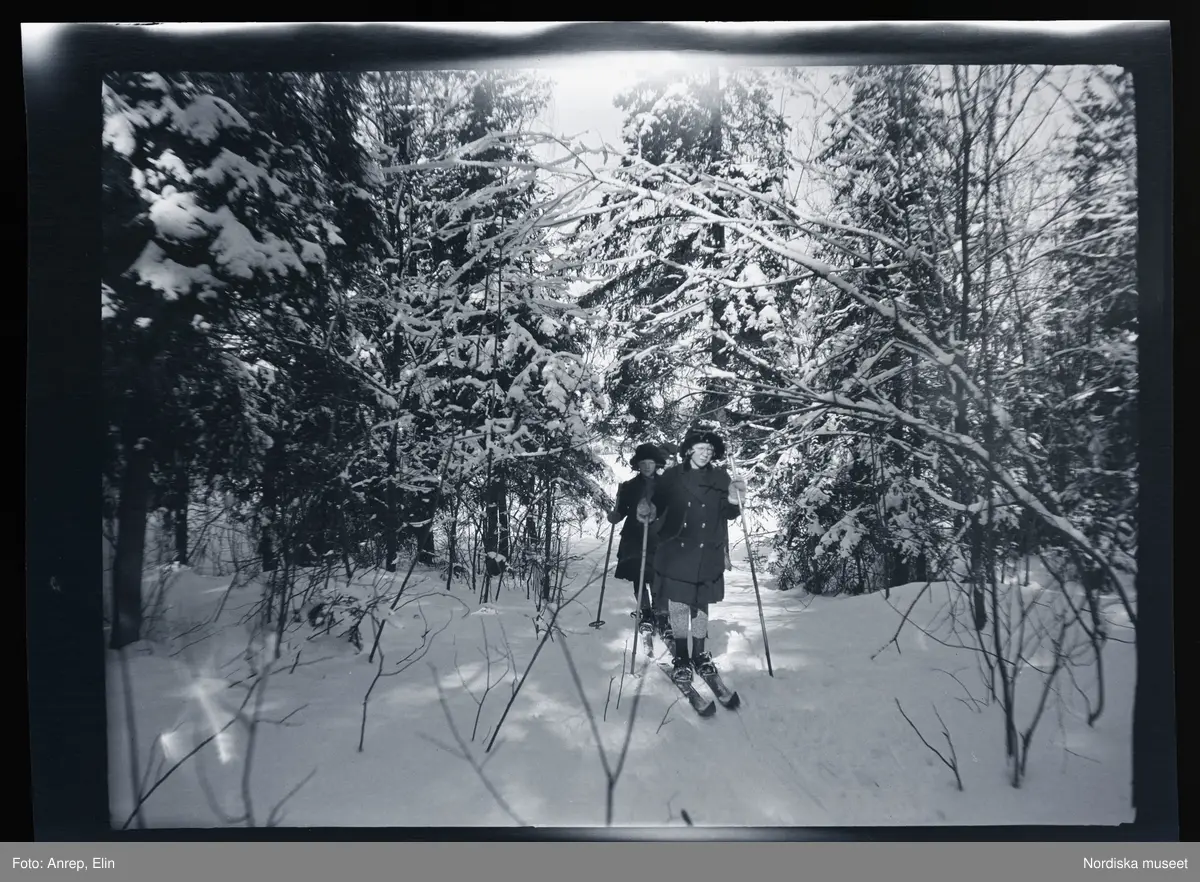 Gudrun och Elsa Morthensen på skidtur i skogen.