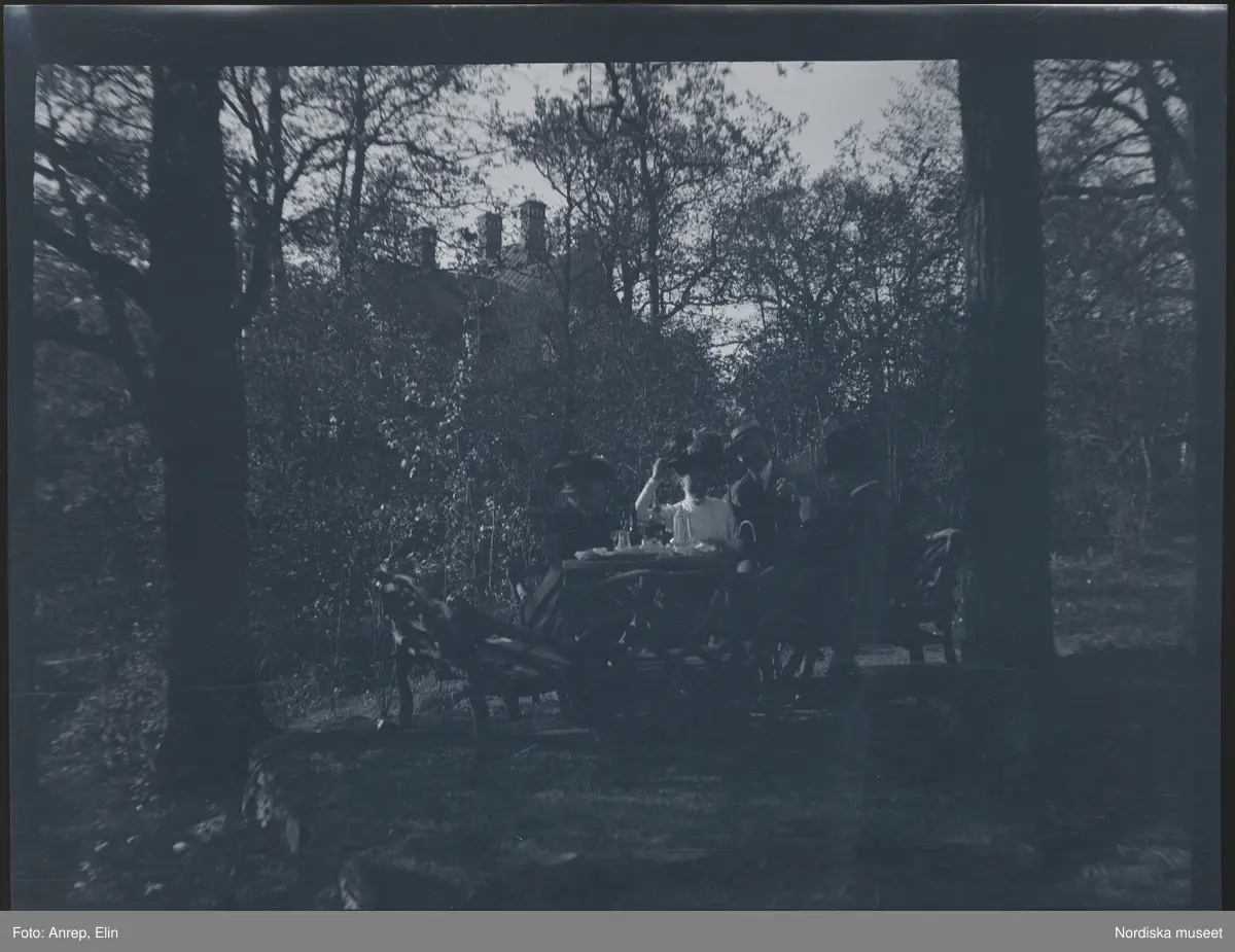 Titel: Kafferep. Ett sällskap sitter samlade i trädgårdsmöblerna vid villa Solveden, Djurholm.