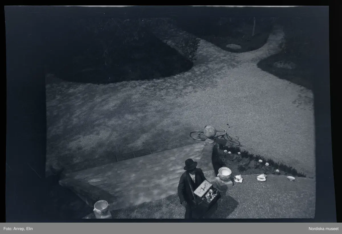 En försäljare med sina varor i en låda på magen, framför porten till villa Solveden, Djurholm.