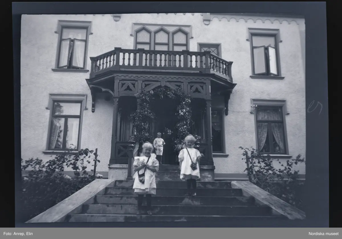 Syskonen Sven, Elsa och Gudrung på trappan till familjen Morthensens villa Solveden, Djursholm.