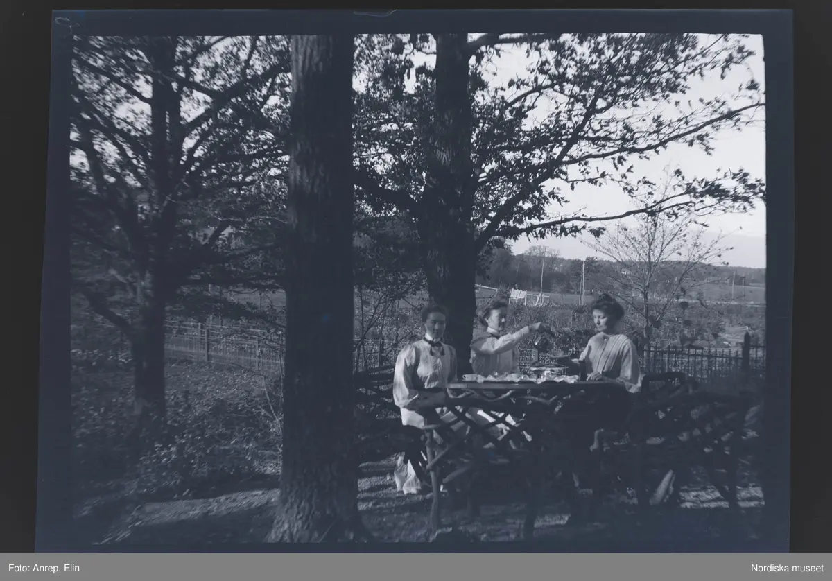 Kafferep. Tre kvinnor sitter i trädgårdsmöblerna vid familjen Morthensens villa Solveden, Djursholm.