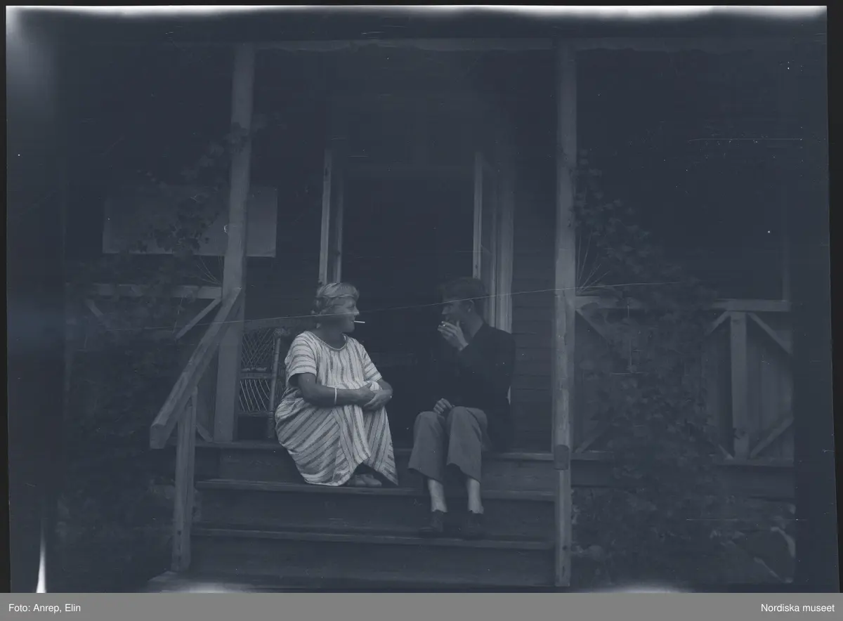 Ett ungt par sitter ute på farstukvisten och röker.