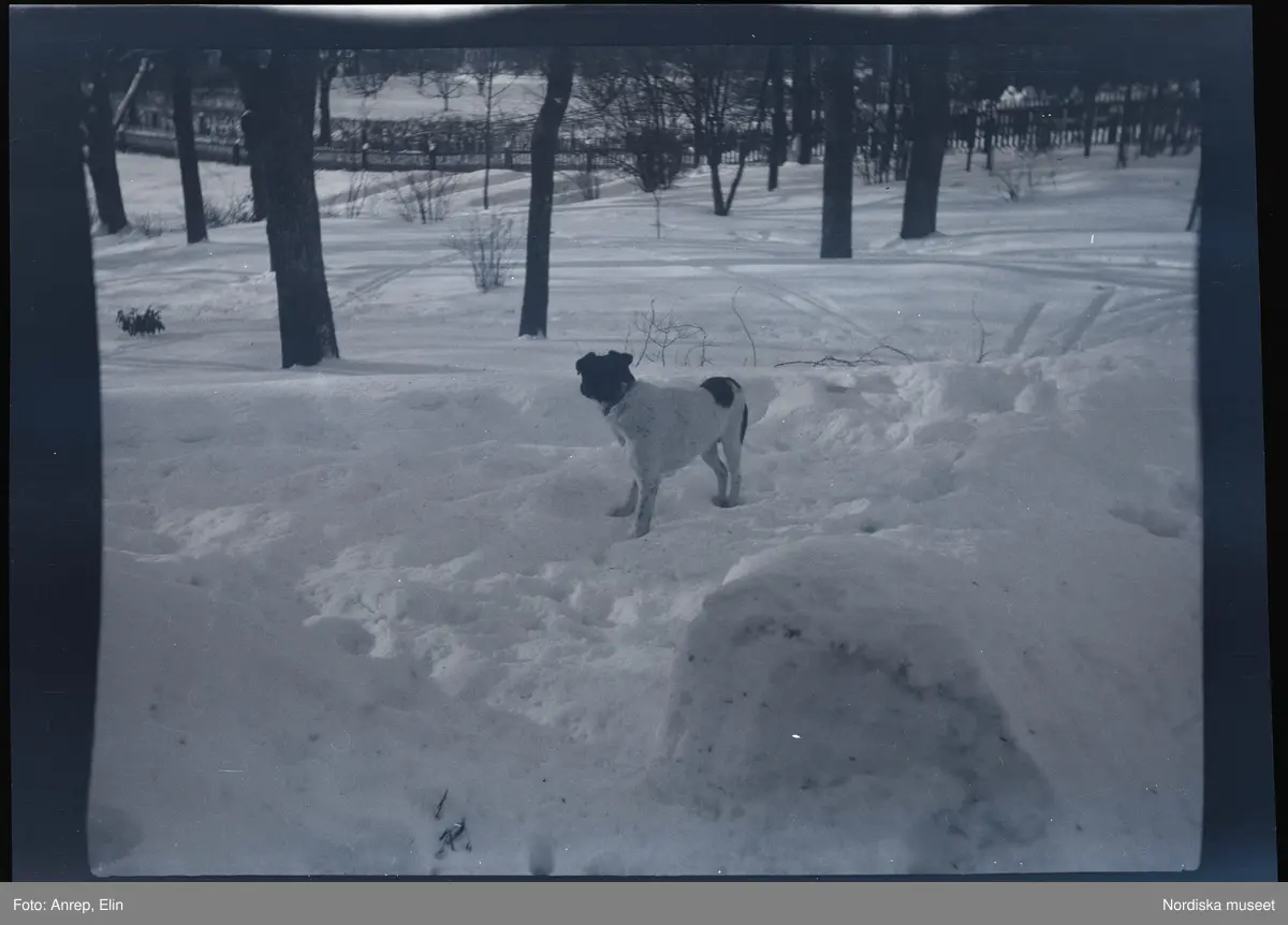 En hund i snön på tomten till familjen Morthensens villa Solveden, Djursholm.
