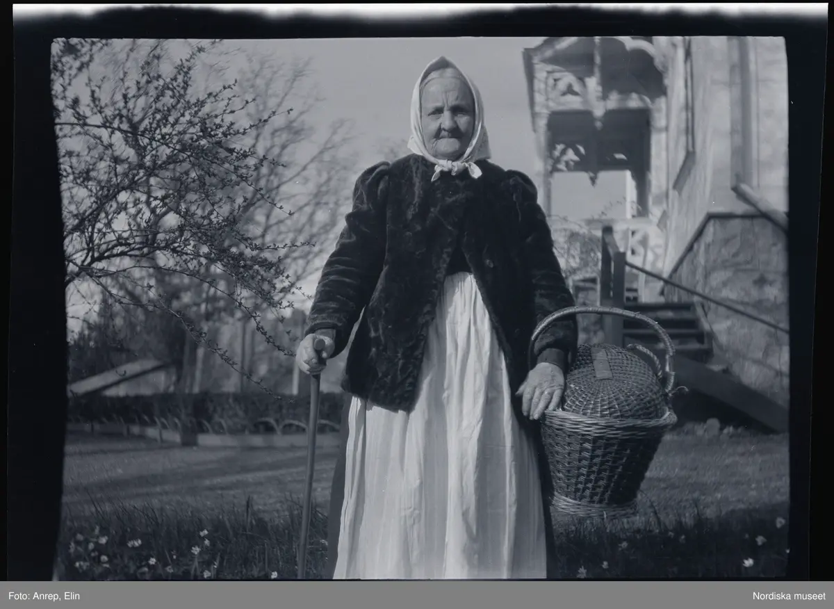 En äldre kvinna med käpp och korg på armen, utanför familjen Morthensens villa Solveden, Djursholm.