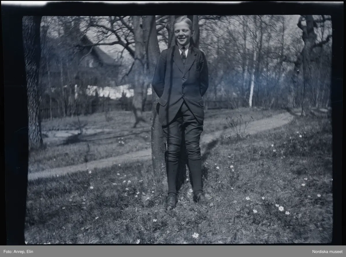 Pojke porträtterad på tomten till familjen Morthensens villa Solveden, Djursholm.