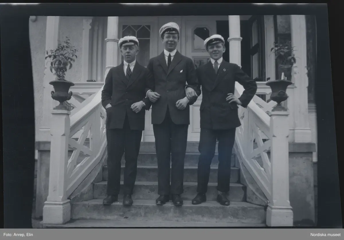 De tre bröderna Morthensen, Sven (mitten) Birger och Gunnar arm i arm på trappen till familjens villa Solveden. Alla bär studentmössor.