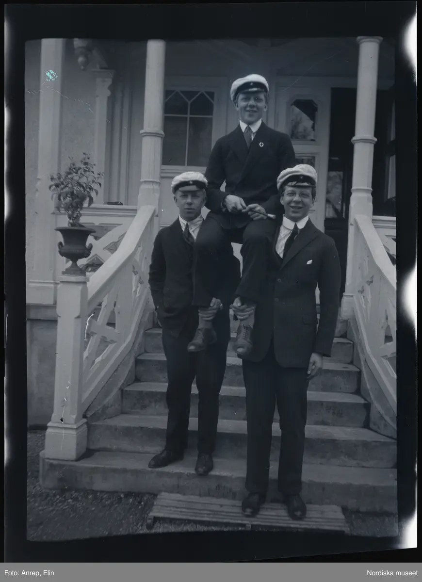 De tre bröderna Morthensen, Sven (mitten) Birger och Gunnar på trappen till familjens villa Solveden. Alla bär studentmössor.