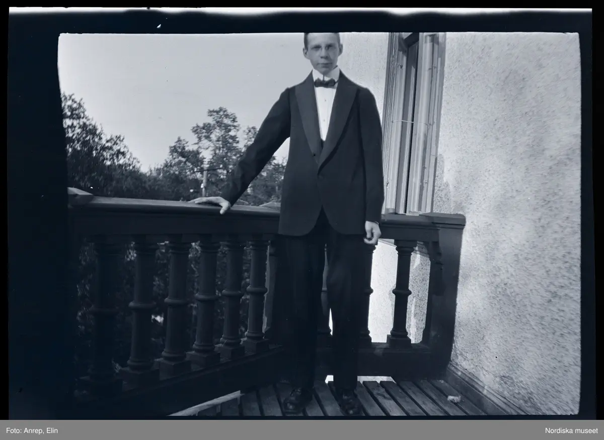 Sven Morthensen porträtterad finklädd på balkongen till familjen Morthensens villa Solveden, Djursholm.