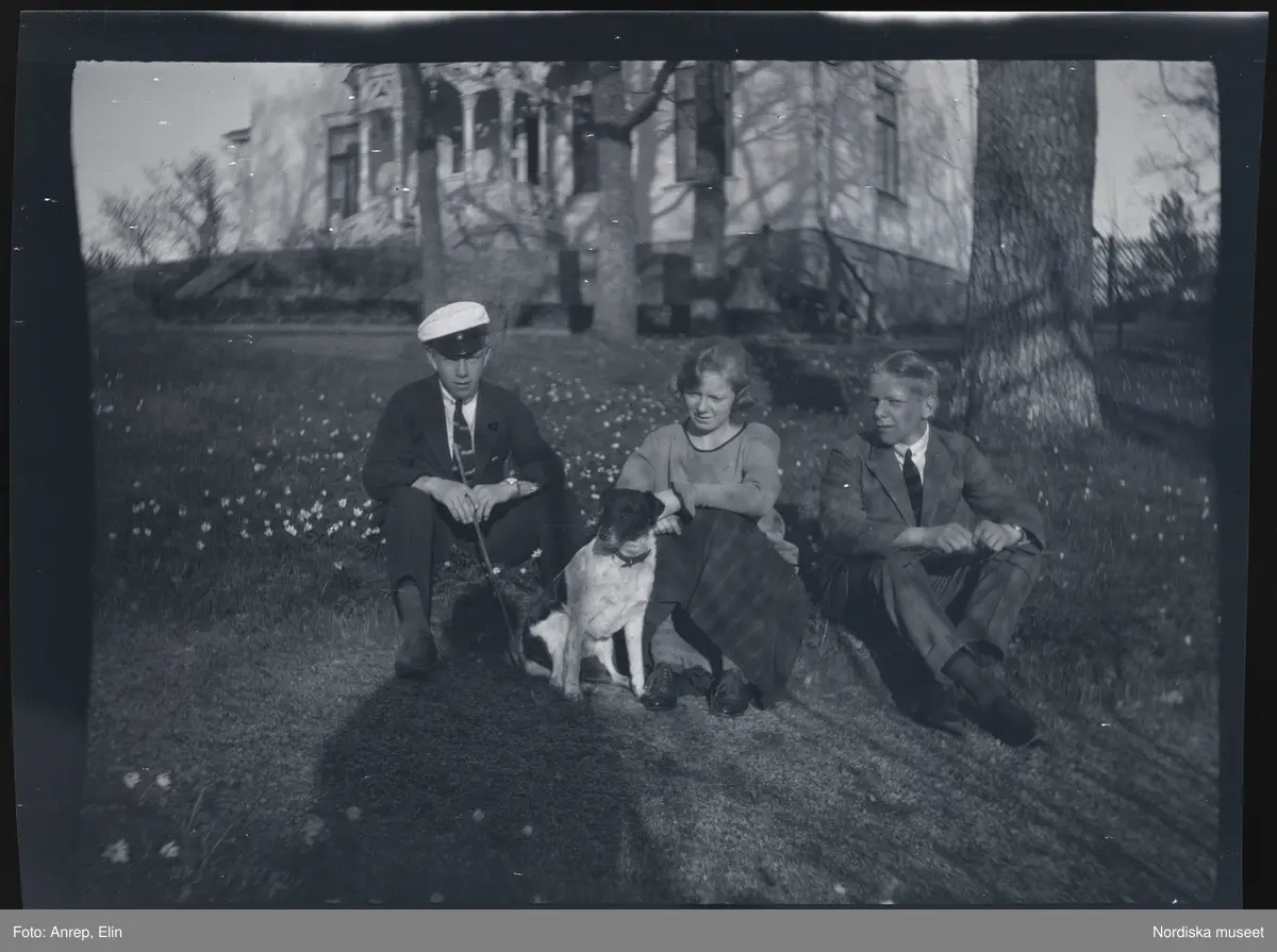 Tre av syskonen med en hund, utanför familjen Morthensens villa Solveden, Djursholm.