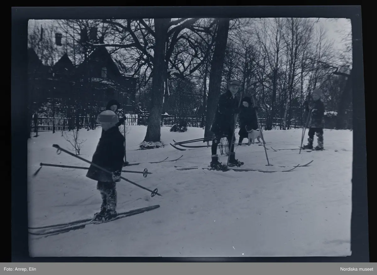 Barn på skidor. På tomten till familjen Morthensens villa Solveden, Djursholm.