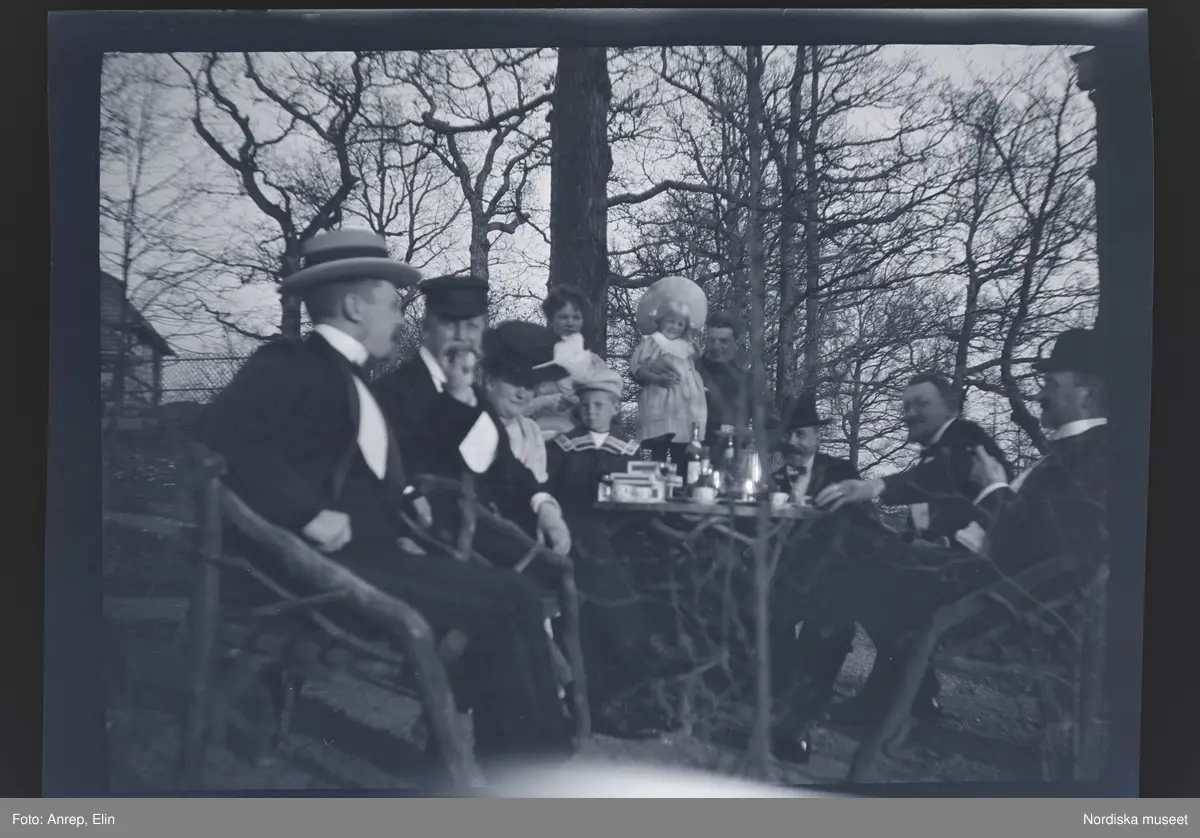 Ett sällskap sitter samlade i trädgårdsmöblerna vid villa Solveden, Djurholm.