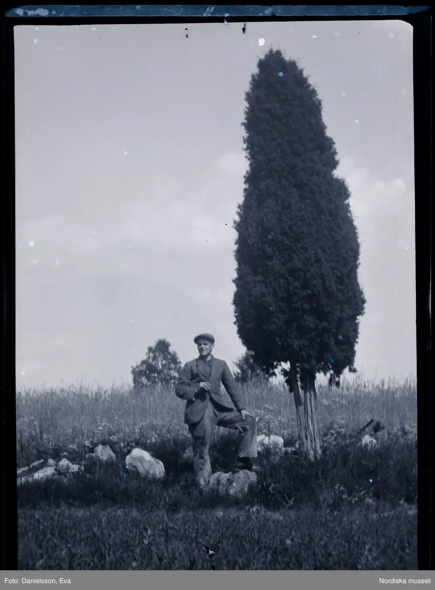 En man står intill en stor en som växer i kanten av ett fält.